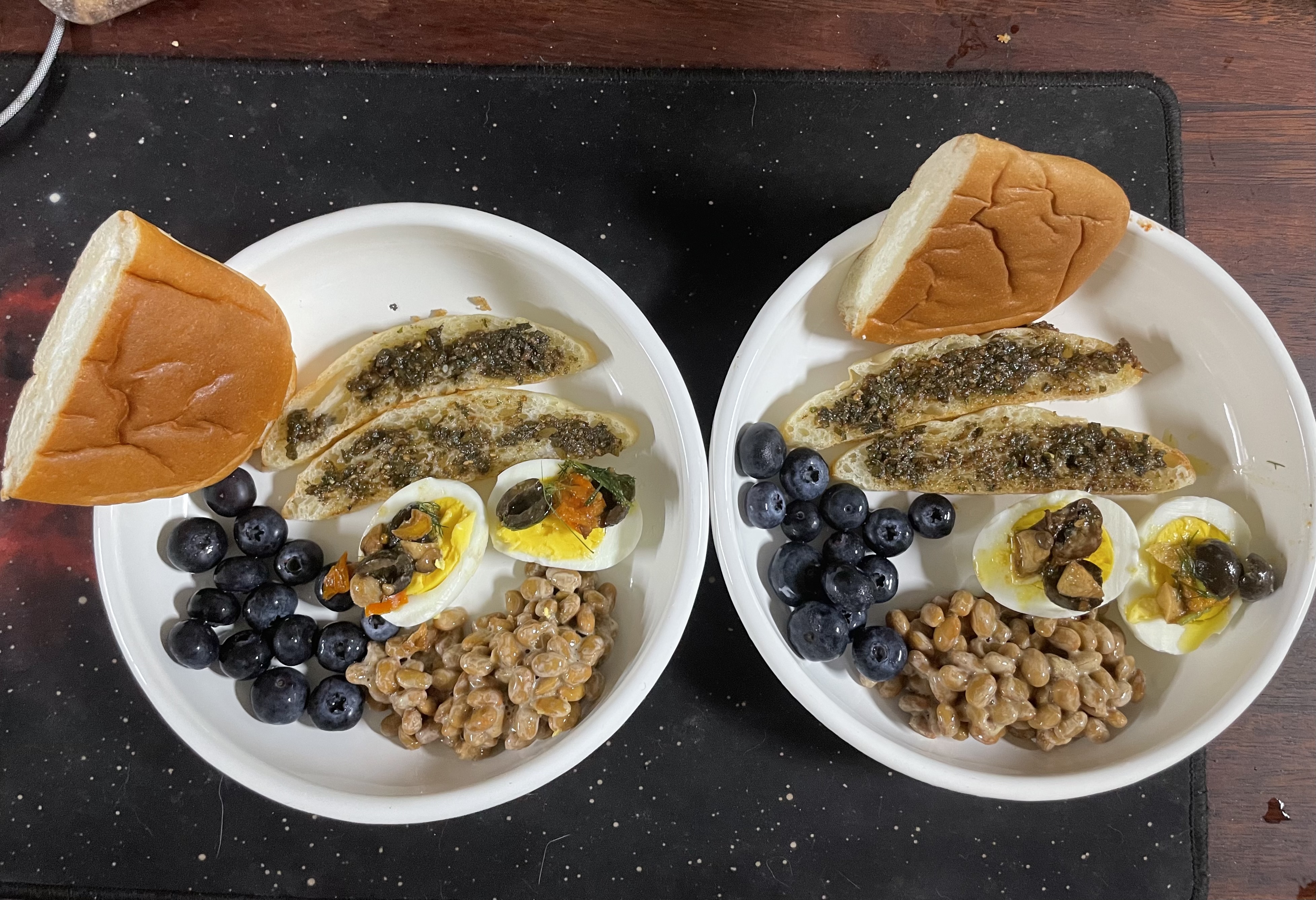 대충 이런 식이다. 낫또에 제철 과일과 먹다 남은 빵이나 떡.. 혹은 소세지나 치킨 조각..이렇게...